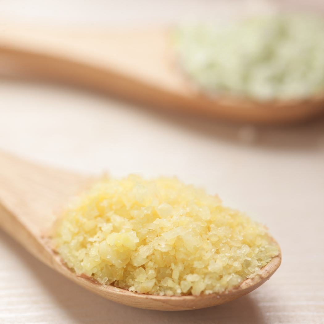 - Add a generous amount of bath salts to warm running water in the bathtub.